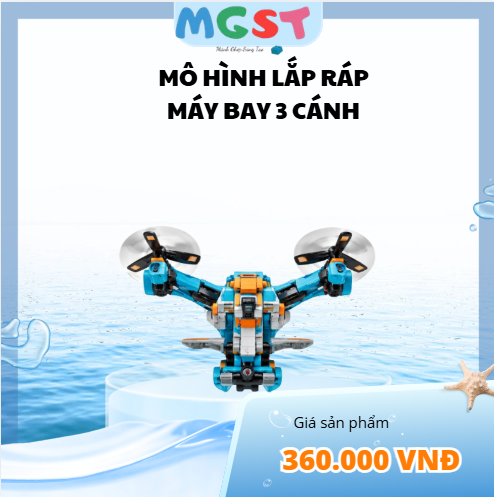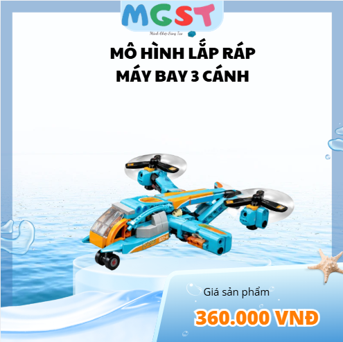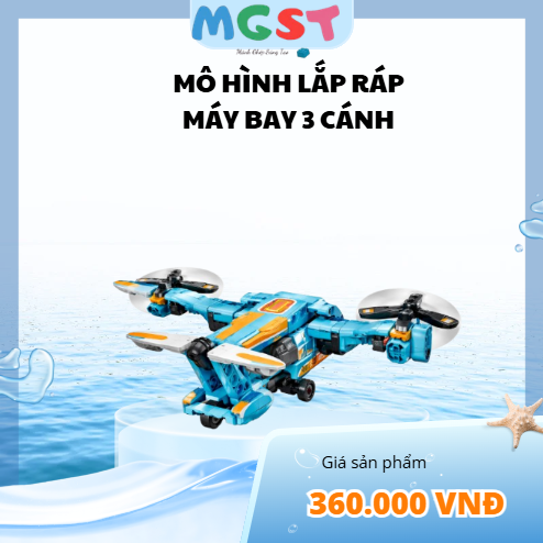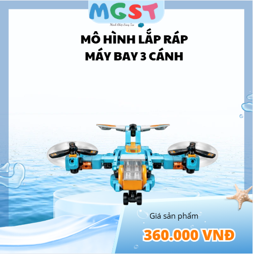 Cánh và động cơ: Máy bay có 3 cánh quạt (2 ở hai bên và 1 phía sau), mỗi cánh đều gắn động cơ dạng xoay giống drone hoặc máy bay VTOL. Cánh quạt màu đen với chi tiết cam.