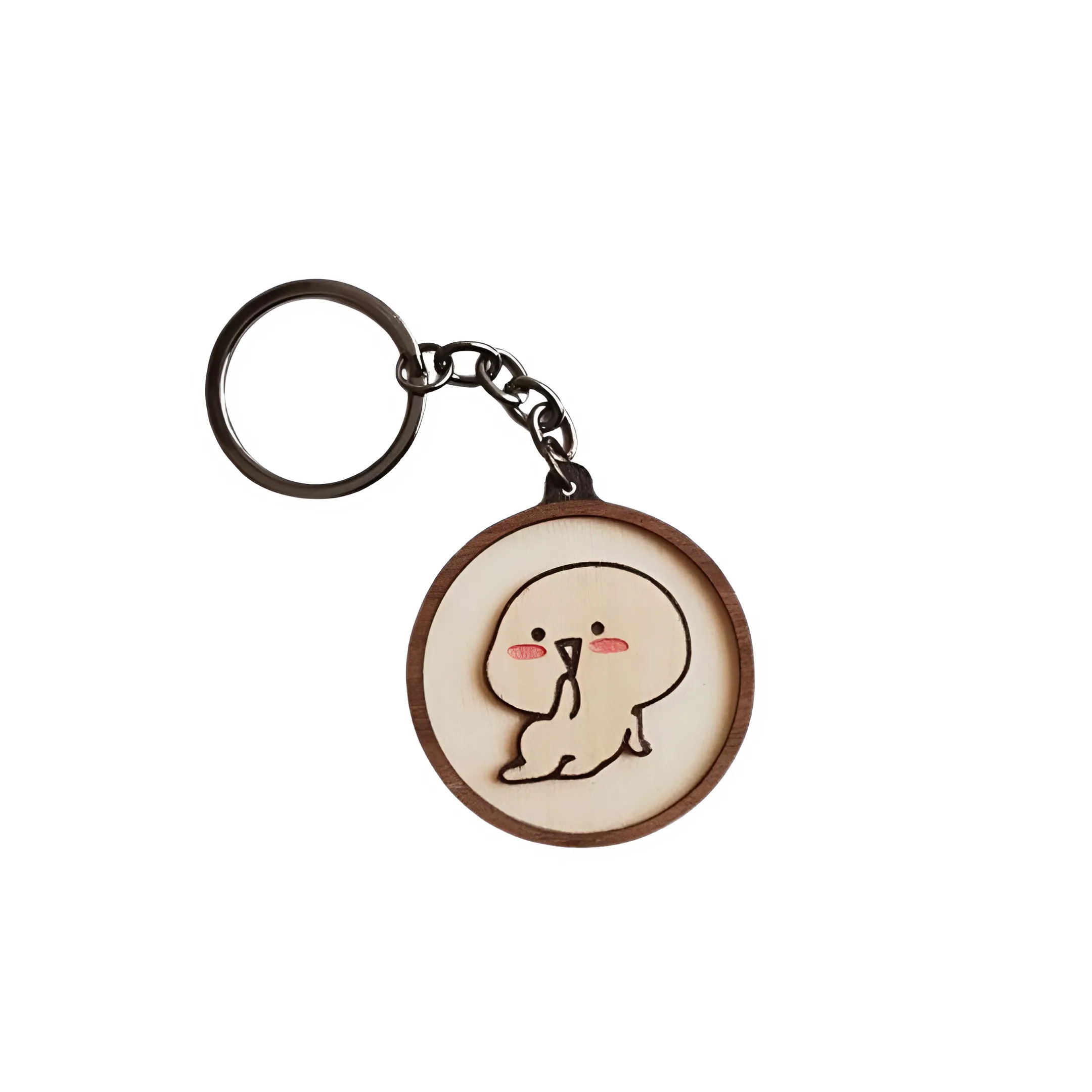 Chiếc móc khóa dễ thương với hình ảnh một nhân vật hoạt hình ngộ nghĩnh, có khuôn mặt bầu bĩnh, đôi mắt nhỏ và hai má hồng đáng yêu. Được chế tác từ gỗ và được khắc laser cùng những đường viền đen nổi bật, các chi tiết được tô màu tỉ mỉ tạo nên hình ảnh sinh động và rõ nét. Sản phẩm này lý tưởng để giữ chìa khóa, trang trí túi xách, ba lô hoặc làm quà tặng đáng yêu cho những người yêu thích sự dễ thương và độc đáo.