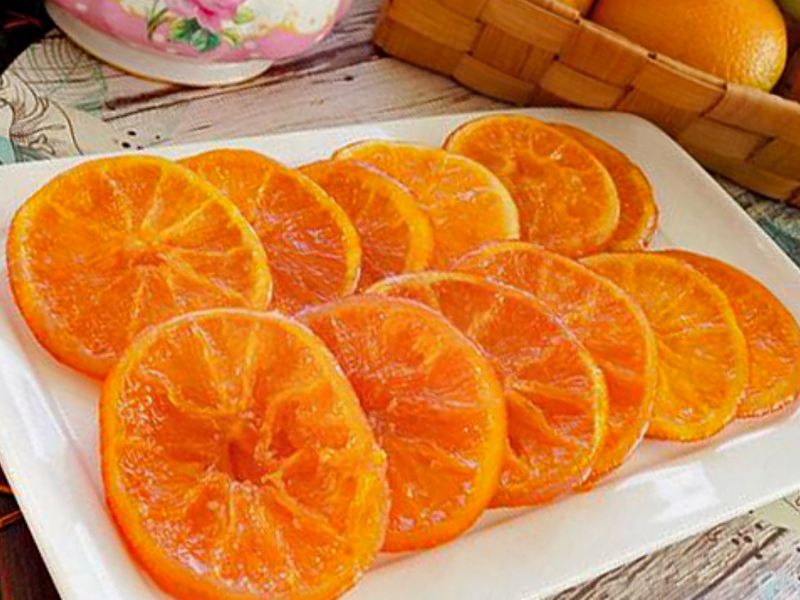 Mứt cam là một món ăn ngon và truyền thống được làm từ quả cam. Quá trình chế biến mứt cam thường bao gồm việc làm mềm và ngọt quả cam bằng cách đun sôi chúng trong đường và nước. Sau đó, quả cam được để nguội và hấp thụ đường, tạo ra lớp đường mứt mịn màng bên ngoài.
