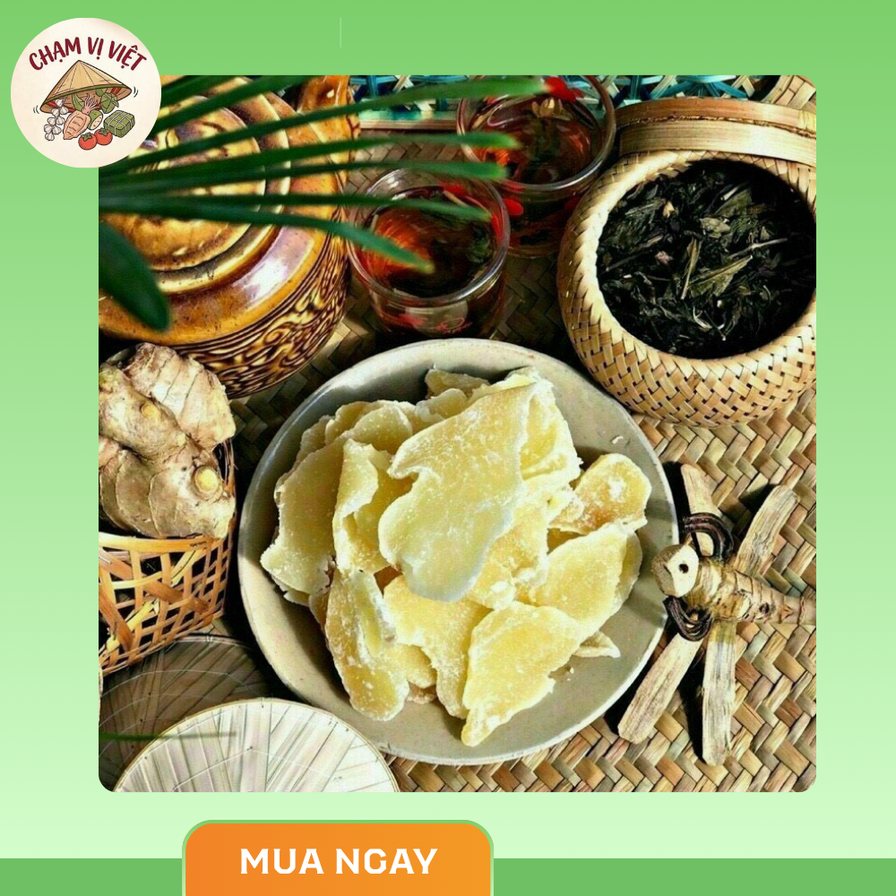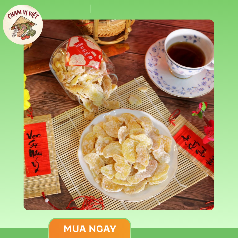 Mứt gừng Chạm Vị Việt là món đặc sản truyền thống mang hương vị cay nhẹ, ngọt thanh, giúp làm ấm cơ thể và kích thích vị giác. Sản phẩm được làm từ gừng tươi tuyển chọn, chế biến theo phương pháp thủ công, giữ trọn hương vị tự nhiên và đậm chất Việt.