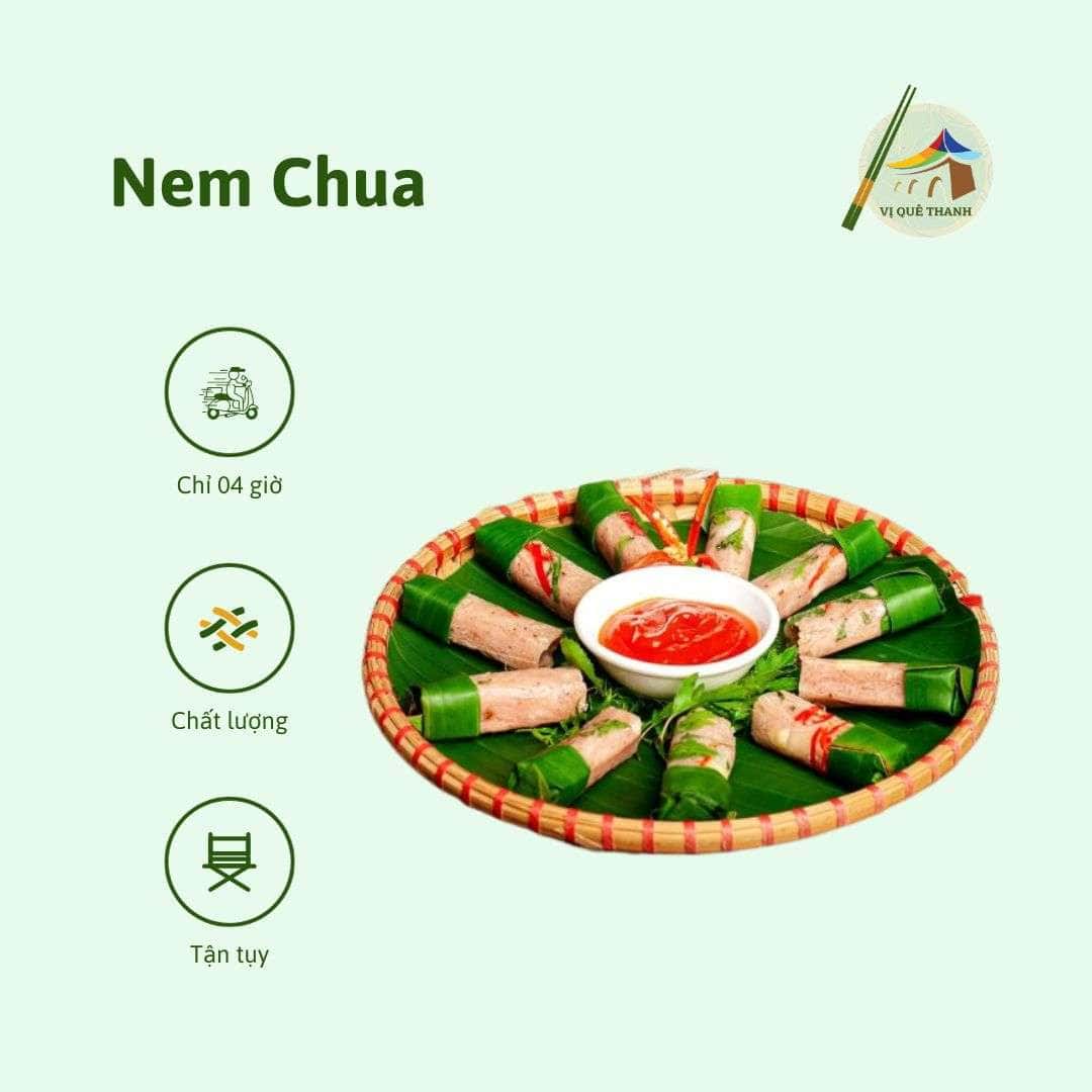 Đặc sản Thanh Hóa nổi tiếng với đa dạng món ngon từ món mặn đến món ngọt. Và không thể không nhắc tới nem chua, món ăn được cho là tượng trưng cho ẩm thực xứ Thanh. Được làm từ thịt heo, da heo, lá ổi, lá đinh lăng và các loại gia vị. Nguyên liệu được ướp vừa vị, bọc lá chuối và được lên men Khối lượng: 250 gram/10 chiếc