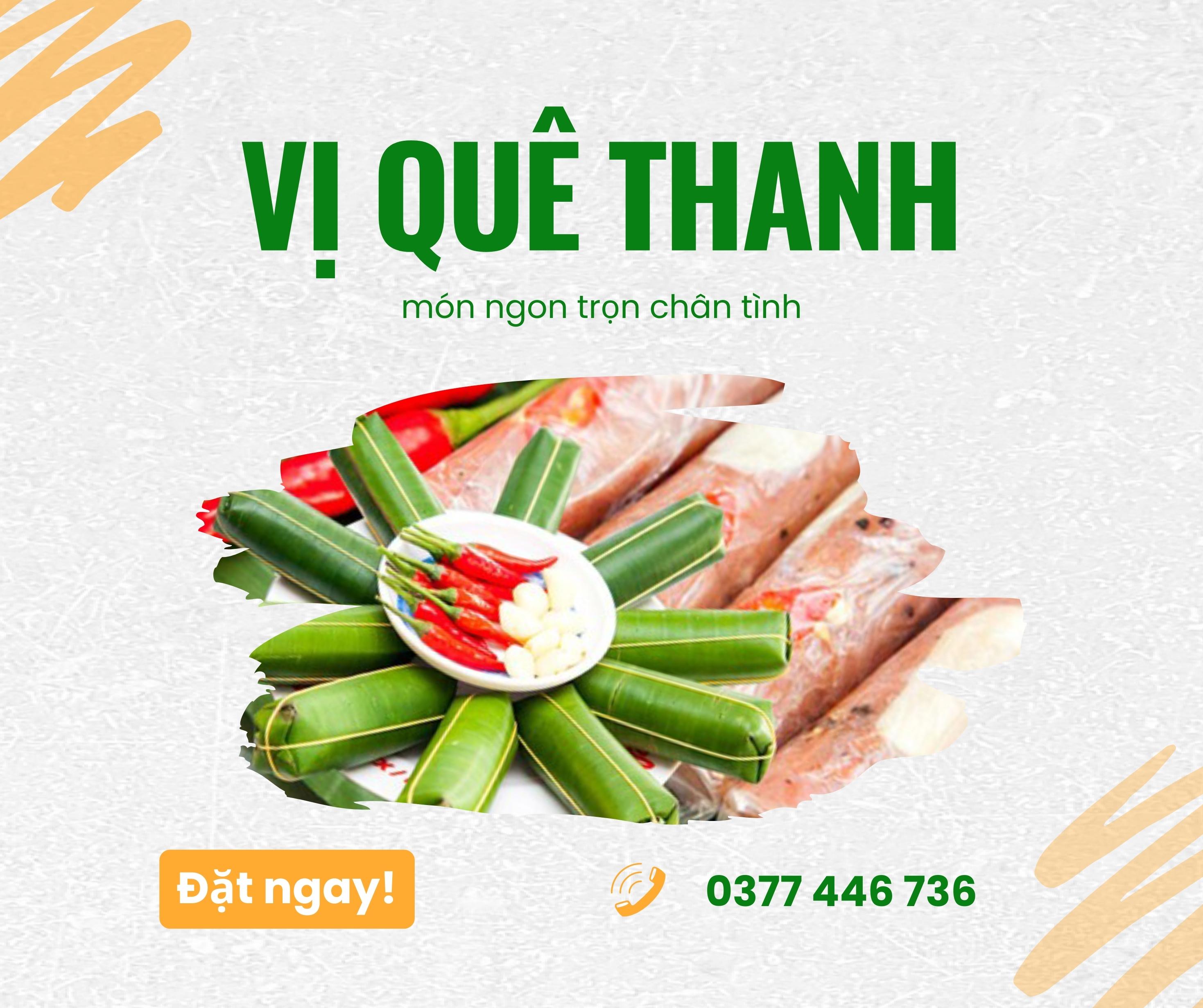 "Vị Quê Thanh" là một cửa hàng trực tuyến được thành lập năm 2023 tại Sài Gòn, chuyên cung cấp đặc sản Thanh Hóa. Với phương châm "Món ngon trọn chân tình", chúng tôi mong muốn đem đến cho khách hàng trải nghiệm đặc sản Thanh Hóa một cách trọn vẹn nhất. Chúng tôi luôn cam kết làm việc với tấm chân tình của người con xứ Thanh. Chuyên cung cấp: Bánh gai Tứ Trụ, Nem chua Thanh Hóa, Nem nướng, Chè lam Phủ Quảng, Bánh nhãn, Chả tôm Sầm Sơn, Giò Thủ, Chả lụa...
