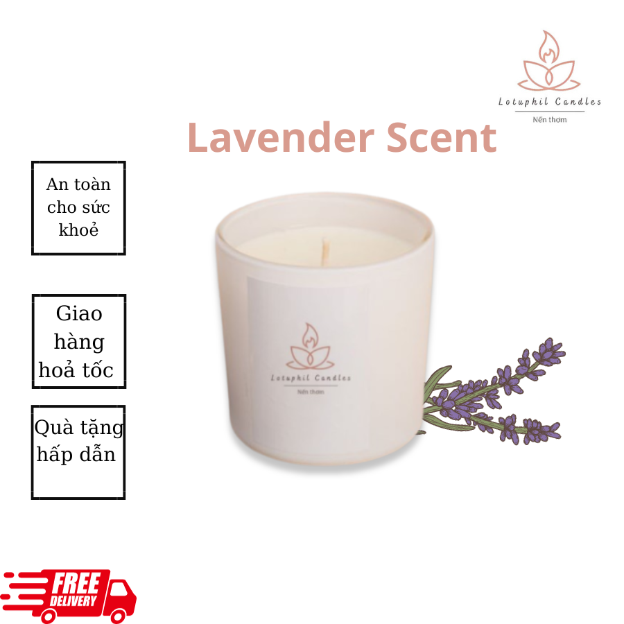 Nến thơm Lavender mùi oải hương của Lotuphil Candles. được làm hoàn toàn bằng 100% sáp đậu nành và tinh dầu oải hương nguyên chất mang hương thơm của vườn hoa Lavender đến nhà bạn. Sản phẩm rất thân thiện với môi trường và an toàn với sức khỏe khi sử dụng lâu dài. Giúp thanh lọc cơ thể và có thể giải quyết các vấn đề về mất ngủ.