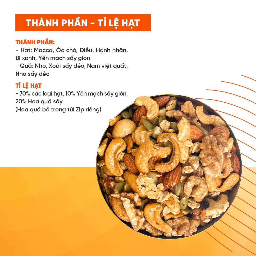 > Thành phần: Yến mạch, Hạt điều, Óc chó, Dừa sấy, Nho khô, Bí xanh, Mơ sấy dẻo