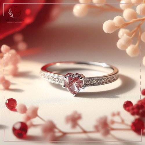 Nhẫn MoonAura mang vẻ đẹp thanh lịch với viên đá hồng hình trái tim lấp lánh, tượng trưng cho tình yêu và sự chân thành. Phần viền nhẫn được chạm khắc họa tiết tinh xảo, tạo nên sự sang trọng và cổ điển.