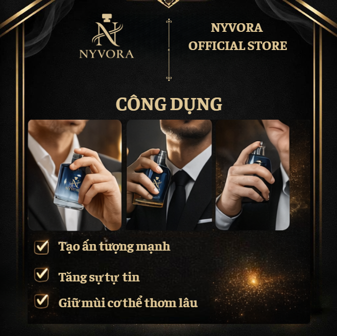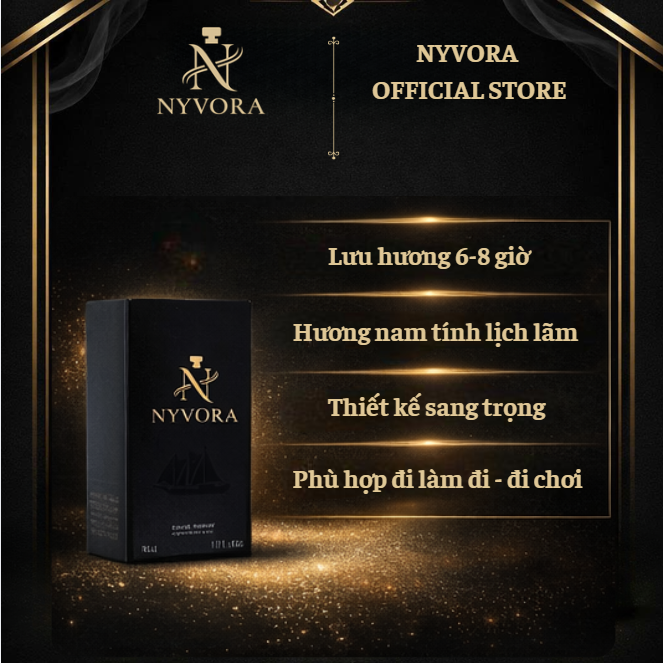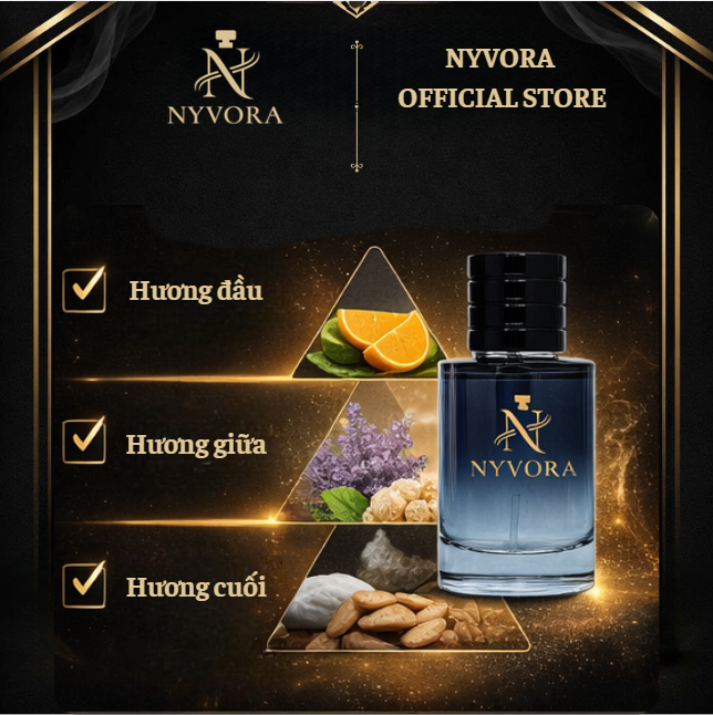 NYVORA Eau De Parfum mang đến mùi hương hiện đại, nam tính và đầy cuốn hút. Thiết kế chai tối giản kết hợp tone đen – vàng sang trọng, phù hợp với những người đàn ông tự tin và lịch lãm.