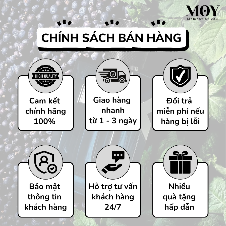 THÔNG TIN THƯƠNG HIỆU: MOY Perfume Website: moy.com.vn Địa chỉ: MOY Perfume, 45/14A Trần Thái Tông, Phường 15, Tân Bình, Hồ Chí Minh Số điện thoại: 0967548393 - 0922701803 Email: moy.cosmetic.2024@gmail.com