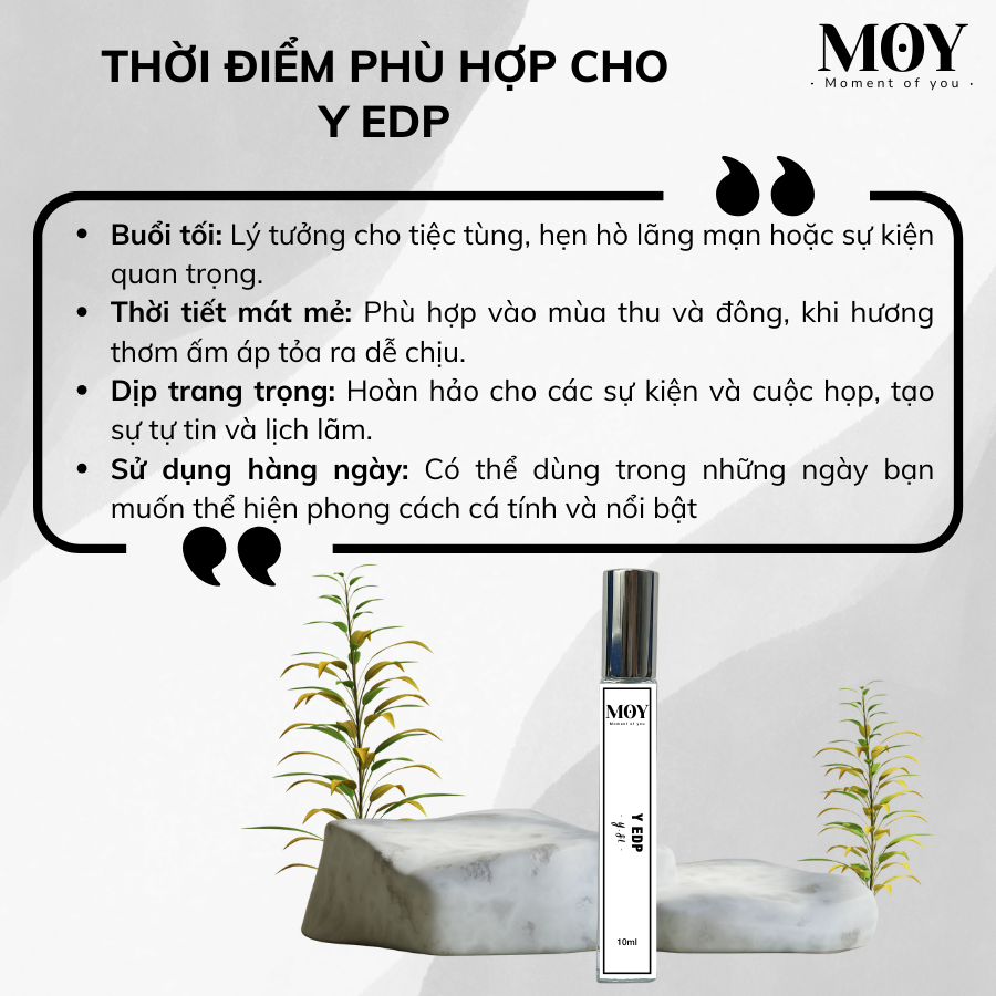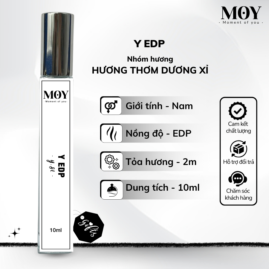 Nước hoa MOY Perfume – Moment of You, là thương hiệu phân phối các dòng nước hoa, đảm bảo chất lượng. Với Y.SL Y EDP, nước hoa MOY luôn mong muốn mang đến cho khách hàng một trải nghiệm hương thơm tươi mới và đầy năng lượng. Y.SL Y EDP là lựa chọn lý tưởng cho những người đàn ông hiện đại, tự tin và yêu thích sự phá cách, giúp bạn nổi bật và để lại ấn tượng mạnh mẽ trong mọi tình huống.