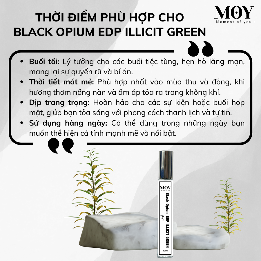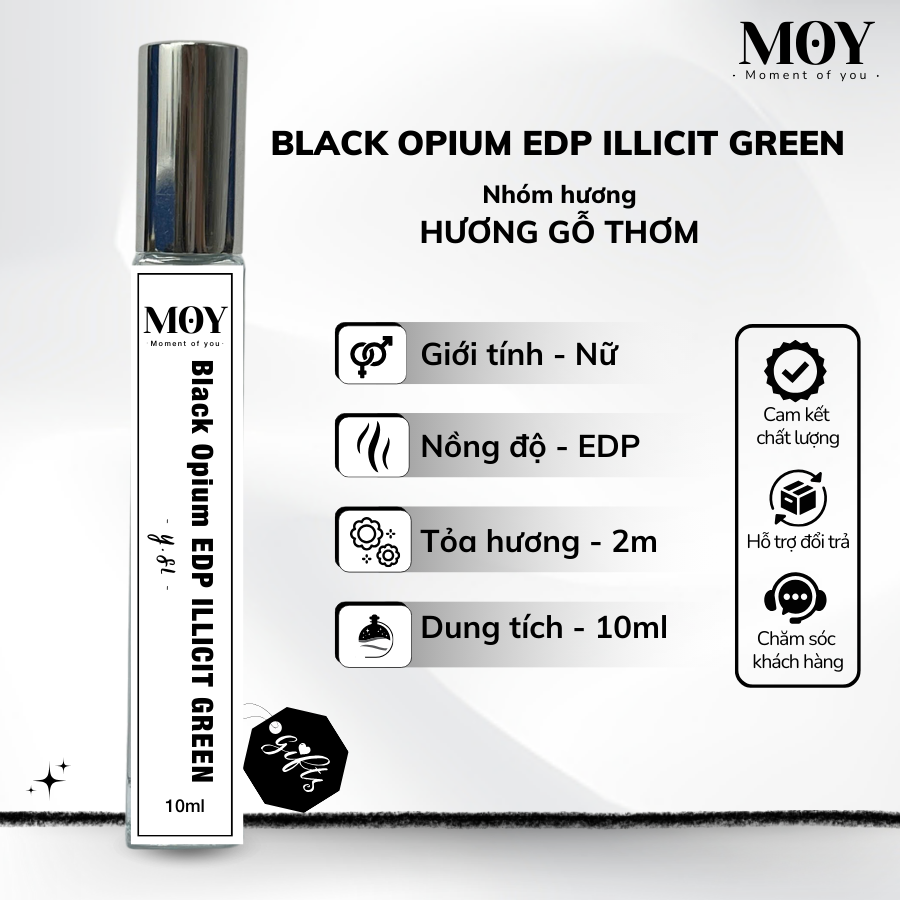 Nước hoa MOY Perfume – Moment of You, là thương hiệu phân phối các dòng nước hoa, đảm bảo chất lượng. Với Black Opium Illicit Green, nước hoa MOY mong muốn mang đến cho khách hàng một trải nghiệm hương thơm quyến rũ và đầy bí ẩn. Đây là sự lựa chọn lý tưởng cho những người phụ nữ hiện đại, tự tin và yêu thích sự nổi bật, giúp bạn tỏa sáng và thu hút mọi ánh nhìn trong mọi tình huống.
