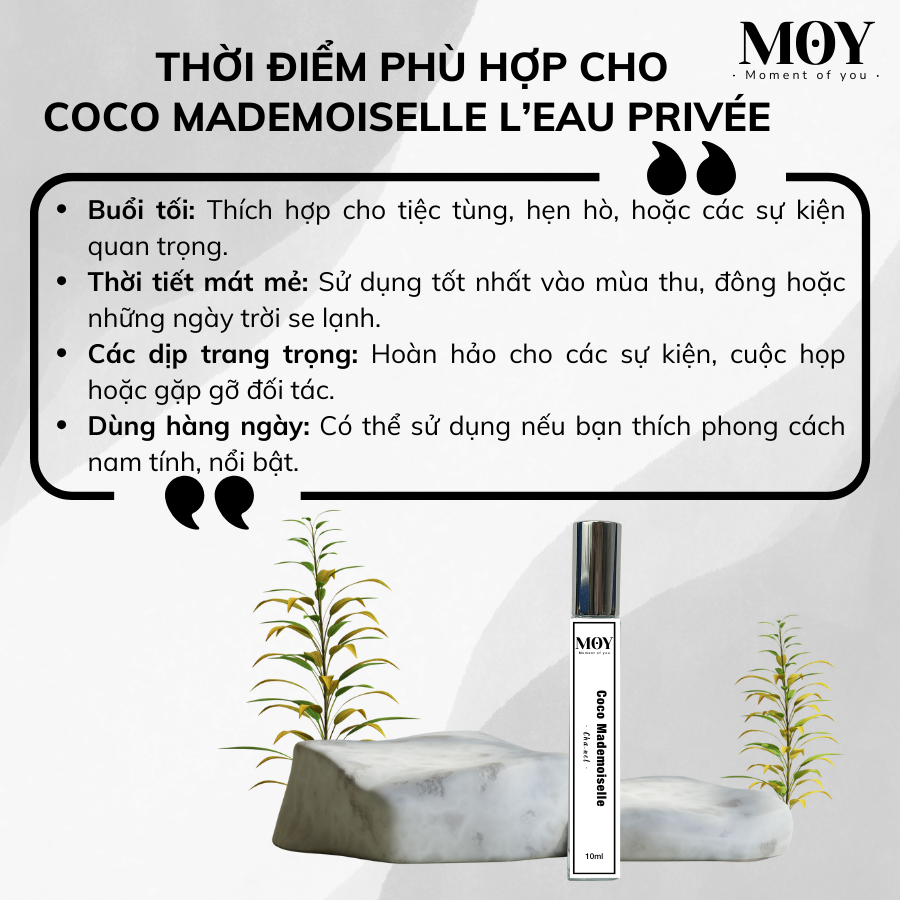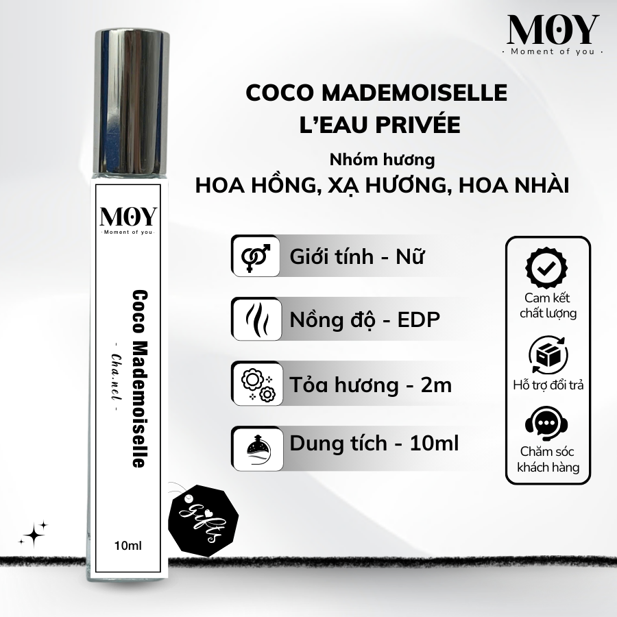 Nước hoa MOY Perfume – Moment of You, là thương hiệu phân phối các dòng nước hoa, đảm bảo chất lượng. Với Coco Mademoiselle L’Eau Privéel, nước hoa MOY luôn mong muốn mang đến cho khách hàng một trải nghiệm nước hoa tươi mát và ấm áp khiến bạn luôn quyến rũ trong mọi tình huống, là biểu tượng của sự sang trọng đại diện cho phong cách sống đẳng cấp.