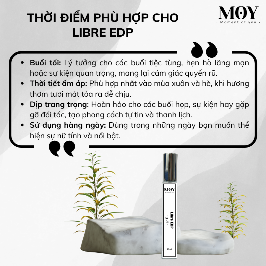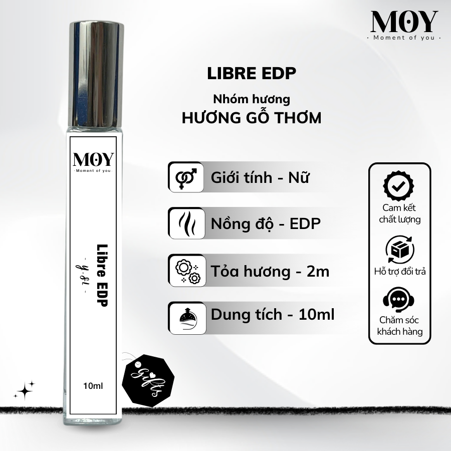 Nước hoa MOY Perfume – Moment of You, là thương hiệu phân phối các dòng nước hoa, đảm bảo chất lượng. Với Libre EDP, nước hoa MOY luôn mong muốn mang đến cho khách hàng một trải nghiệm hương thơm ngọt ngào và mạnh mẽ. Libre EDP là lựa chọn lý tưởng cho những người phụ nữ hiện đại, tự tin và yêu thích sự nữ tính, giúp bạn tỏa sáng và khẳng định phong cách trong mọi tình huống.