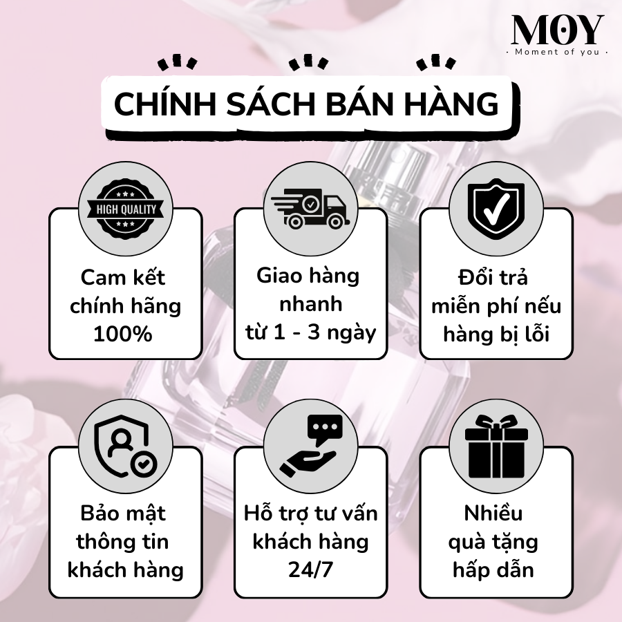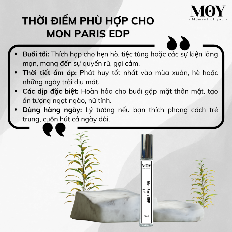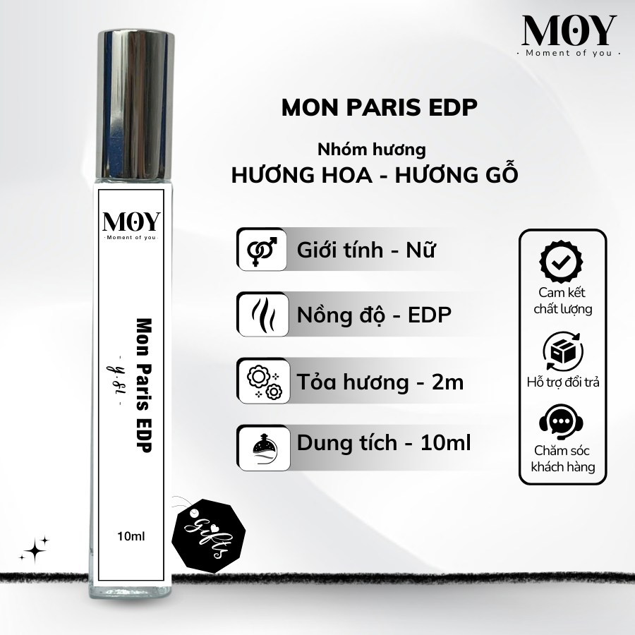Nước hoa MOY Perfume – Moment of You, là thương hiệu phân phối các dòng nước hoa, đảm bảo chất lượng. Với Mon Paris, nước hoa MOY luôn mong muốn mang đến cho khách hàng một trải nghiệm hương thơm ngọt ngào và lối cuốn. Nước hoa này thể hiện sự lãng mạn và quyến rũ, rất phù hợp cho những ai yêu thích vẻ đẹp thanh lịch và nữ tính.