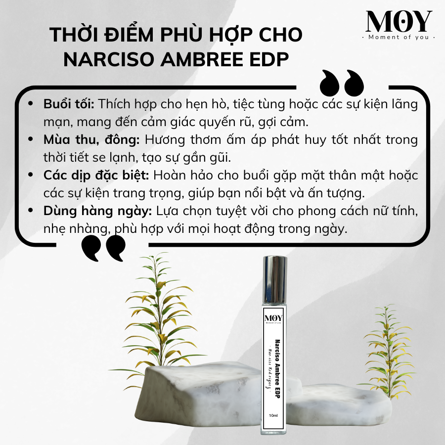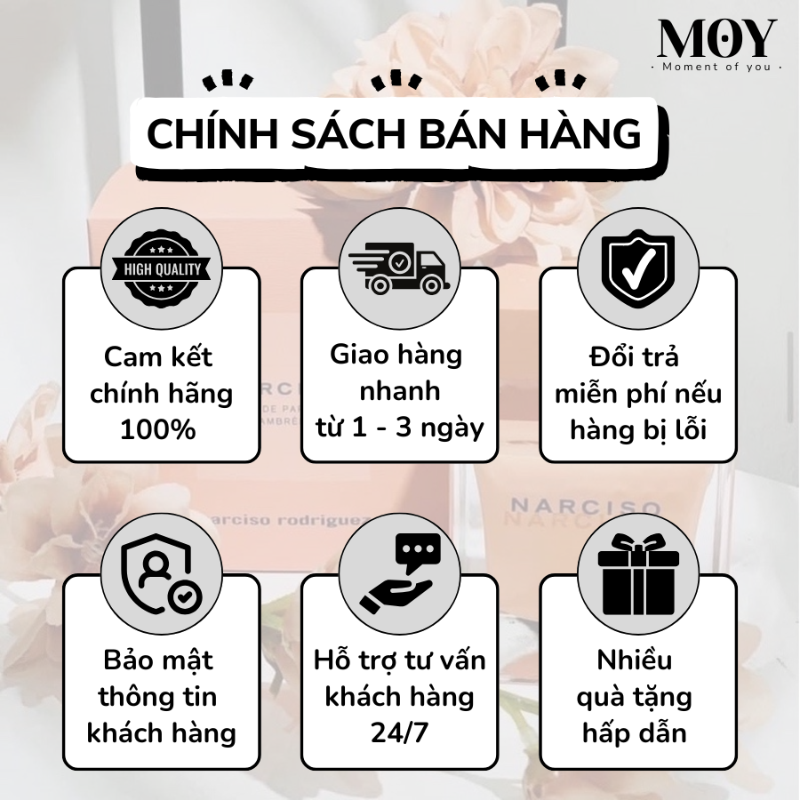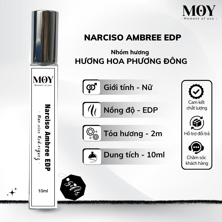 Nước hoa MOY Perfume – Moment of You, là thương hiệu phân phối các dòng nước hoa, đảm bảo chất lượng. Với Narciso Ambree EDP, MOY không chỉ cung cấp một hương thơm quyến rũ mà còn tạo ra một trải nghiệm tuyệt vời, thể hiện vẻ đẹp và sự tự tin của phái đẹp. Đây là sản phẩm đại diện cho sự tinh tế và phong cách sống đẳng cấp, giúp bạn tỏa sáng trong mọi khoảnh khắc.