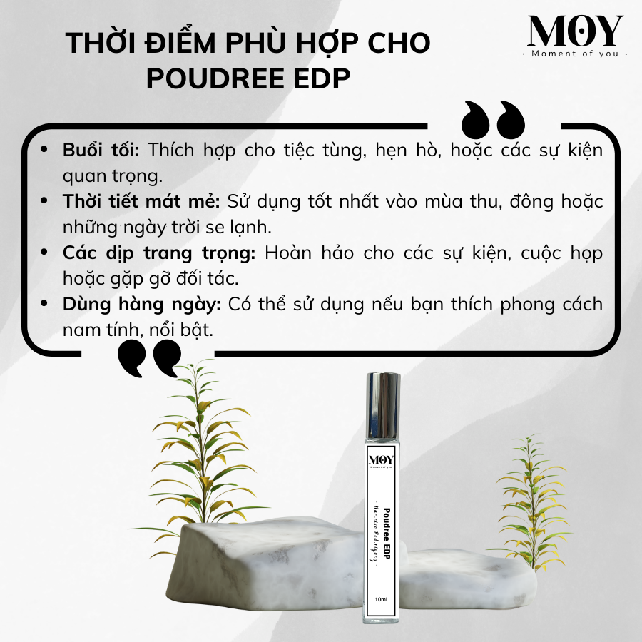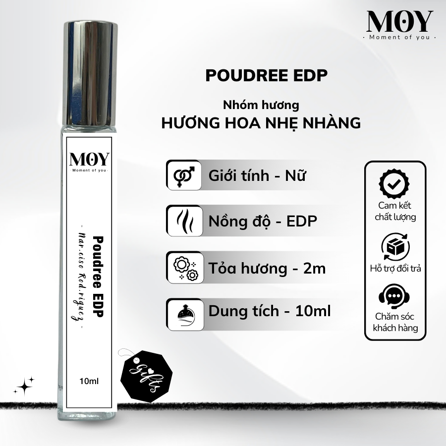 Nước hoa MOY Perfume – Moment of You, là thương hiệu phân phối các dòng nước hoa, đảm bảo chất lượng. Với Poudree EDP, MOY mong muốn mang đến một trải nghiệm hương thơm quyến rũ và thanh lịch, thể hiện sự tinh tế và cá tính của phái đẹp. Sản phẩm này không chỉ là biểu tượng của sự sang trọng mà còn đại diện cho phong cách sống đẳng cấp, giúp bạn tự tin tỏa sáng trong mọi dịp.