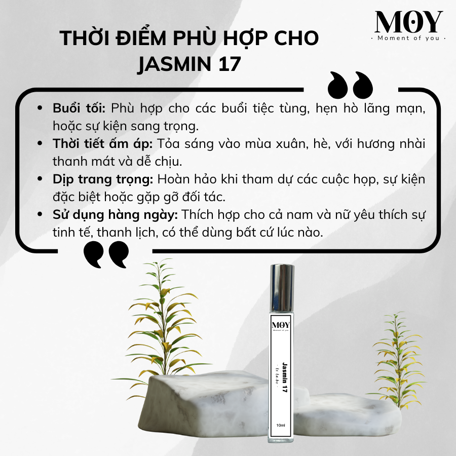 Jasmin 17 là một sự pha trộn hoàn hảo giữa sự ngọt ngào và quyến rũ từ hương hoa nhài, cùng với sự ấm áp của gỗ đàn hương và hổ phách. Hương thơm mang lại cảm giác tinh tế và thanh lịch, phù hợp cho cả nam và nữ. Jasmin 17 thể hiện sự cân bằng tuyệt vời giữa sự dịu dàng và mạnh mẽ, tạo nên một dấu ấn hương thơm khó quên cho những ai tìm kiếm một phong cách thanh lịch và cuốn hút. Đây là sự lựa chọn hoàn hảo cho các dịp đặc biệt hoặc sử dụng hàng ngày.