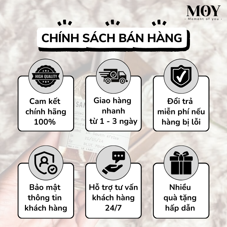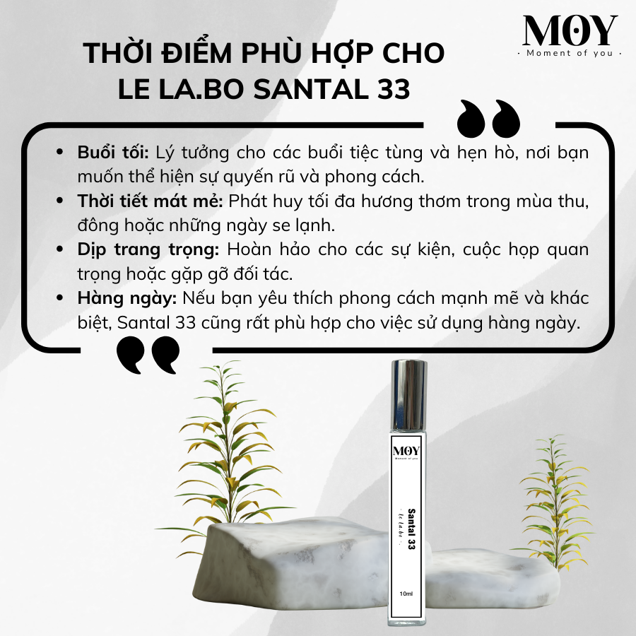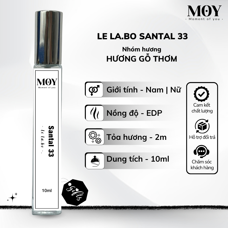 Nước hoa MOY Perfume – Moment of You, là thương hiệu phân phối các dòng nước hoa, đảm bảo chất lượng. Với Le La.bo Santal 33, nước hoa MOY mong muốn mang đến cho khách hàng một trải nghiệm hương thơm độc đáo và ấm áp, hòa quyện giữa hương gỗ đàn hương, da thuộc và các nốt gia vị, tạo nên một mùi hương quyến rũ và khác biệt.