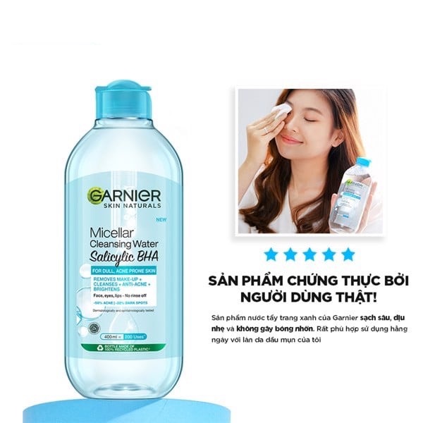 - Dành cho da dầu mụn: Nước làm sạch và tẩy trang đa năng Garnier Micellar Water For Oily & Acne-Prone Skin 400ml nhẹ nhàng làm sach da, lấy đi bụi bẩn, cặn trang điểm và dầu thừa gây ra tình trạng mụn. Phù hợp cho da dầu & da hỗn hợp. Lấy đi dầu thừa mà không gây khô da. Sử dụng công nghệ Micelles (Micellar Technology), phân tử Micelles lấy đi bụi bẩn sâu bên trong lỗ chân lông theo cơ chế hoạt động của nam châm khi lau nhẹ trên da mà không cần chà xát.