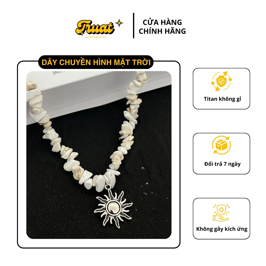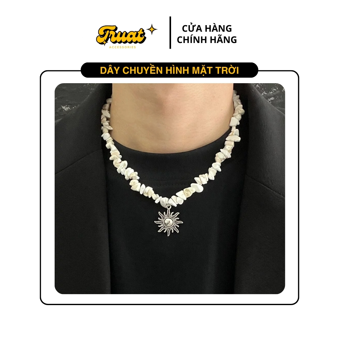 Phụ kiện dây chuyền hình mặt trời là trang sức nổi bật, kết hợp đá tự nhiên và thép titan. Mặt dây sáng bóng tạo điểm nhấn, thể hiện phong cách cá nhân mạnh mẽ và sang trọng, thu hút trong mọi sự kiện.