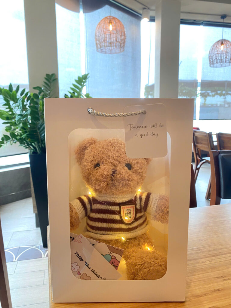 Set quà tặng - Love Bear gồm: Gấu bông Teddy + Túi quà + Đèn led + Thiệp “thả thính” + Quà tặng ngẫu nhiên (móc khóa, kẹp tóc gấu, charm,…)