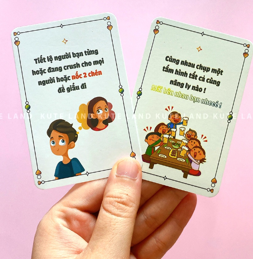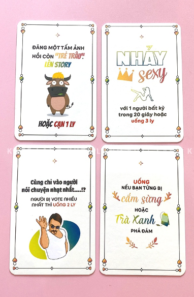 – Luật chơi vô cùng đơn giản. Ngồi theo vòng tròn và đặt bộ bài ở giữa. Lần lượt bốc từng lá bài theo vòng và chỉ cần làm theo chỉ dẫn. Sẽ có những lá bài ĐẶC BIỆT khiến cho tất cả mọi người phải uống hoặc nhưng lá bài miễn tử….