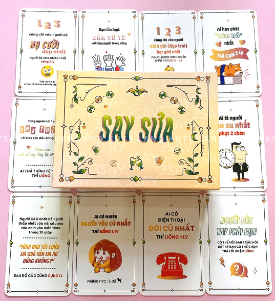 Bộ bài Drinking game SAY SƯA tổng hợp 78 lá bài cho cặp đôi nhóm bùng nổ cuộc vui BẤT NGỜ – HÀI HƯỚC – SỐC TẬN NÃO – là những gì bạn sẽ nhận được qua bộ nài này! THỬ NGAY NHÉ !!!