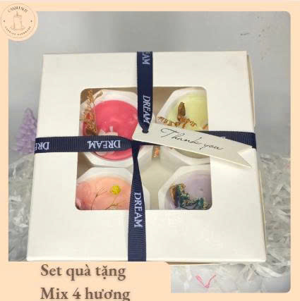 gồm 4 hũ nến nhỏ (mỗi hũ 100g), đóng gói trong hộp quà tặng kèm nơ.
