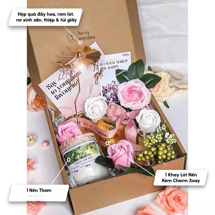 Nến thơm sẽ có tone mùi hương nhẹ nhàng của BST Nến thơm thư giãn và dễ ngủ giúp bạn có một buổi tối ấm áp. Còn Hoa sẽ được sử dụng dòng hoa sáp vĩnh cữu biểu tượng cho tình cảm bền chặt. Các set quà tặng tinh tế đều được tụi mình đóng gói cẩn thận trước khi gửi đi. Đảm bảo chỉn chu nhất khi đến tay người nhận, khách hàng sẽ được tặng kèm Thiệp và Hướng dẫn sử dụng sản phẩm chi tiết.