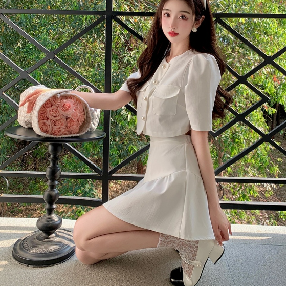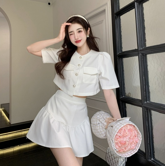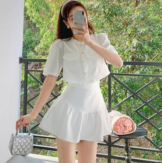 Set váy dạ trắng áo croptop tay bồng mix chân váy xòe phối cúc HOT TREND phong cách HÀN