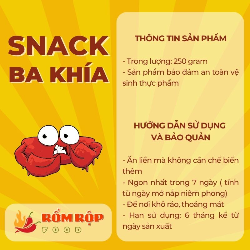 Snack ba khía là một loại đặc sản ẩm thực Việt Nam, có hình dạng giống như chiếc ba khía, một loại cá nhỏ biển Việt Nam. Snack này thường được làm từ bột gạo và các nguyên liệu khác, được chiên giòn để tạo ra vị ngon và hương vị đặc trưng. Snack ba khía thường có hình dạng mảnh nhỏ, giống như chiếc ba khía nhỏ xinh, và có thể được ăn kèm với nhiều loại sốt hoặc gia vị để tăng thêm hương vị. Đây là một loại snack phổ biến trong nền ẩm thực Việt Nam, thích hợp để thưởng thức trong những buổi gặp gỡ bạn bè hoặc làm quà biếu độc đáo.