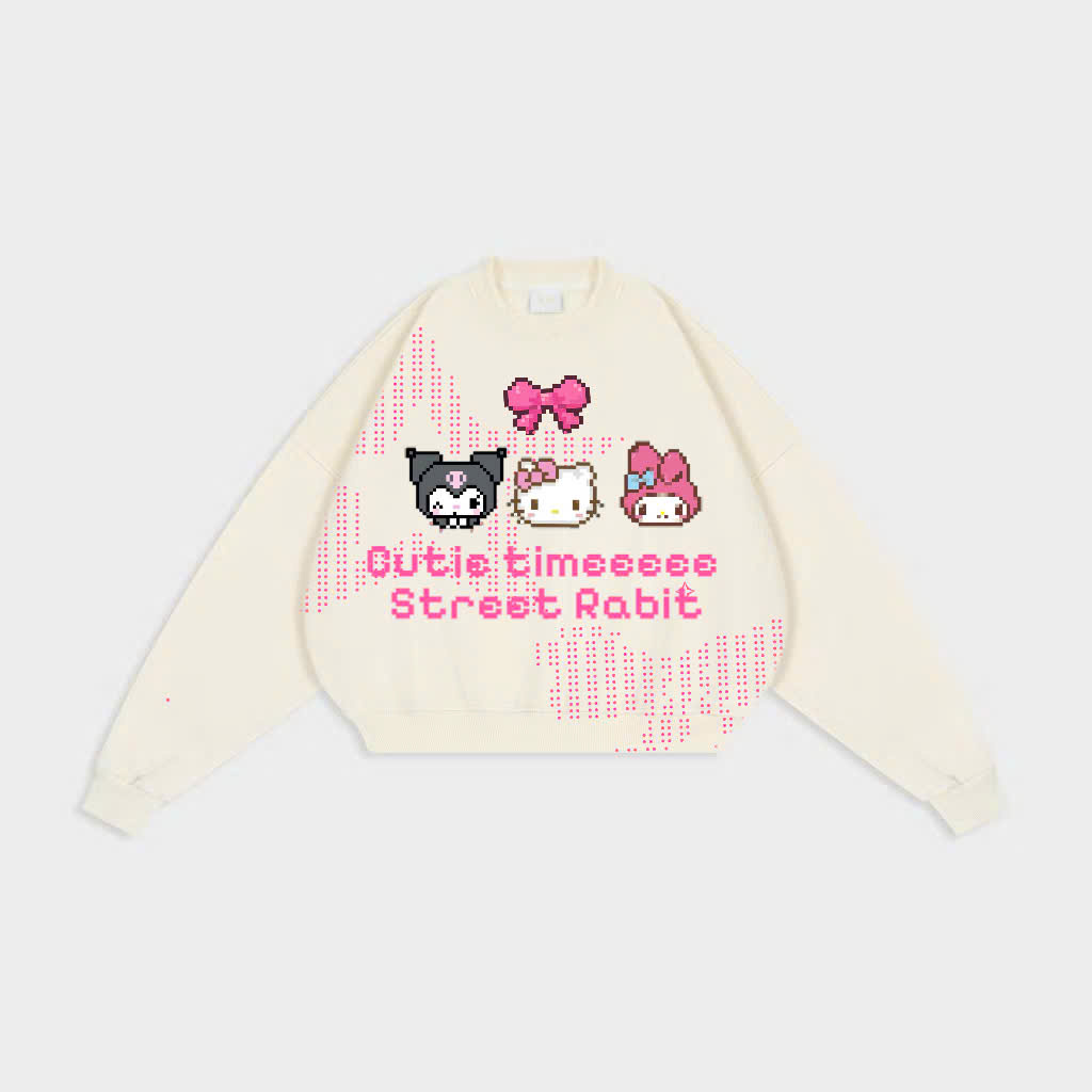 Chiếc nơ hồng to được đặt khéo léo trên đầu hình, cùng dòng chữ “Cutie timeeeee – Street Rabit” tạo nên điểm nhấn vừa vui nhộn vừa cá tính. Đặc biệt, họa tiết pixel tạo hiệu ứng rơi từ trên xuống, khiến chiếc áo trông như một trò chơi 8-bit sống động.