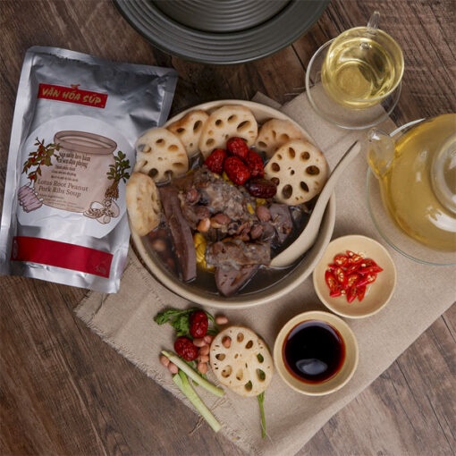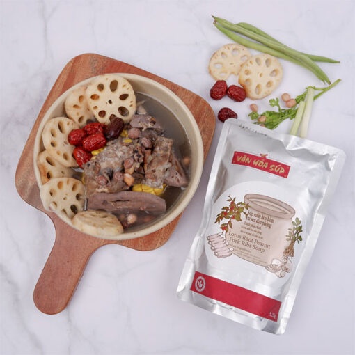 – Sườn heo, củ sen, đậu cô – ve, mực sấy khô, táo đỏ, đậu phộng