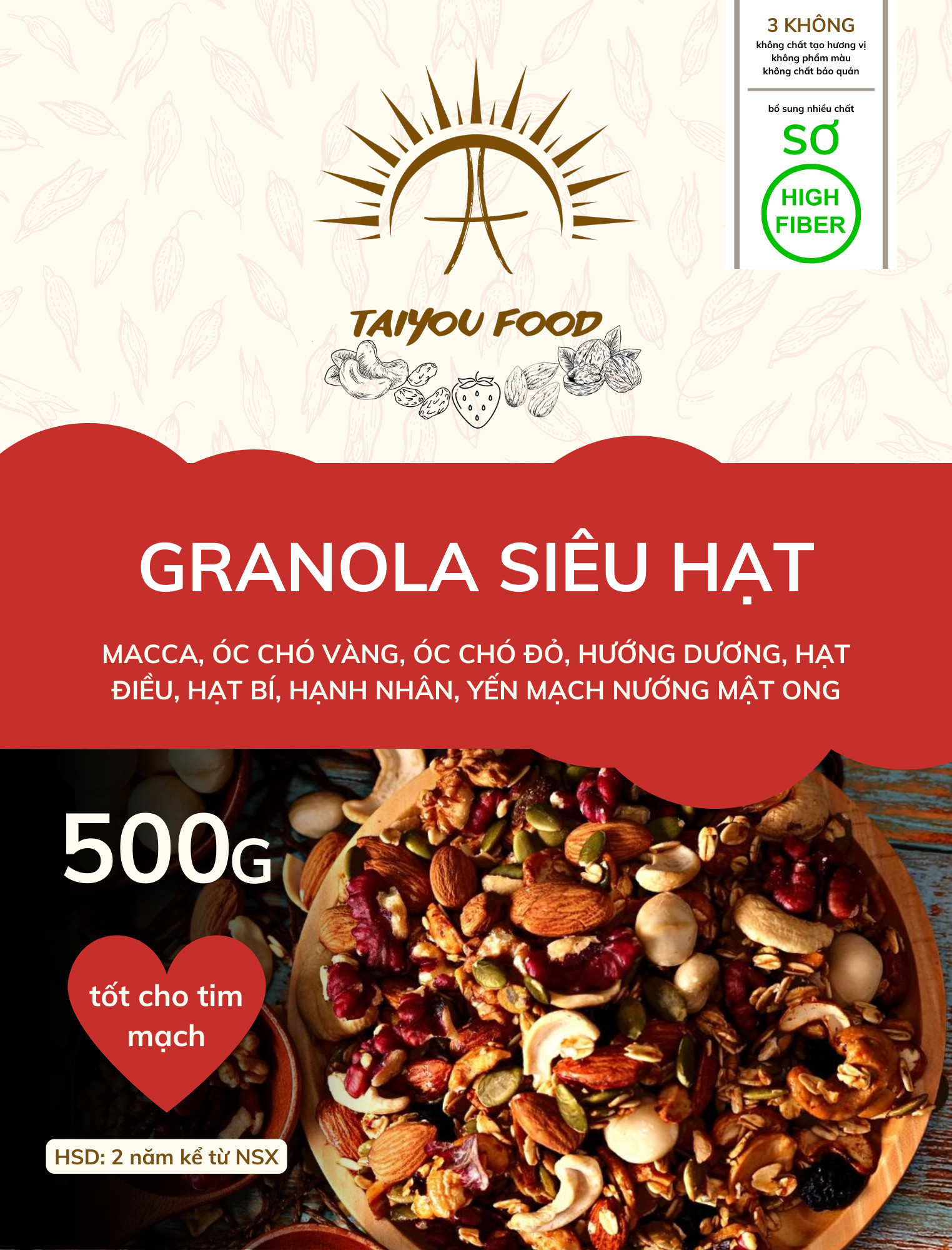 Bạn đang tìm kiếm một loại thực phẩm ăn kiêng ngon miệng, giàu dinh dưỡng và dễ chế biến? Hãy thử granola của TAIYOU food - sản phẩm được làm từ 4 nguyên liệu tự nhiên: hạt óc chó, mật ong, nho khô và hạnh nhân. Granola của TAIYOU food có chất lượng tốt, không chứa chất bảo quản hay hương liệu nhân tạo. Bạn có thể ăn granola với sữa, sữa chua, hoa quả hoặc ăn trực tiếp. Granola của TAIYOU food sẽ cung cấp cho bạn năng lượng, chất xơ, chất béo tốt và các chất chống oxy hóa cần thiết cho sức khỏe. Hãy đặt hàng ngay hôm nay để thưởng thức granola của TAIYOU food - thực phẩm ăn kiêng tuyệt vời cho mọi người.