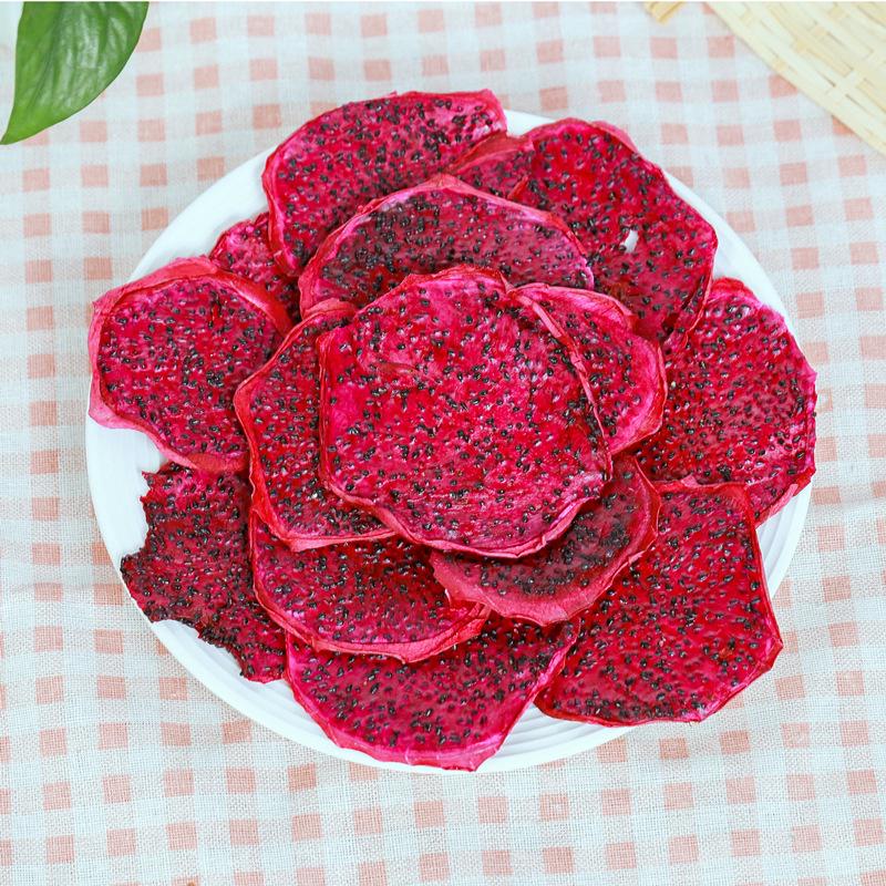 Sau quá trình rút bỏ lượng nước trong quả thanh long sẽ cho ra những miếng thanh long giòn rụm mà vẫn còn giữ lại được hương vị thơm ngon của thanh long.