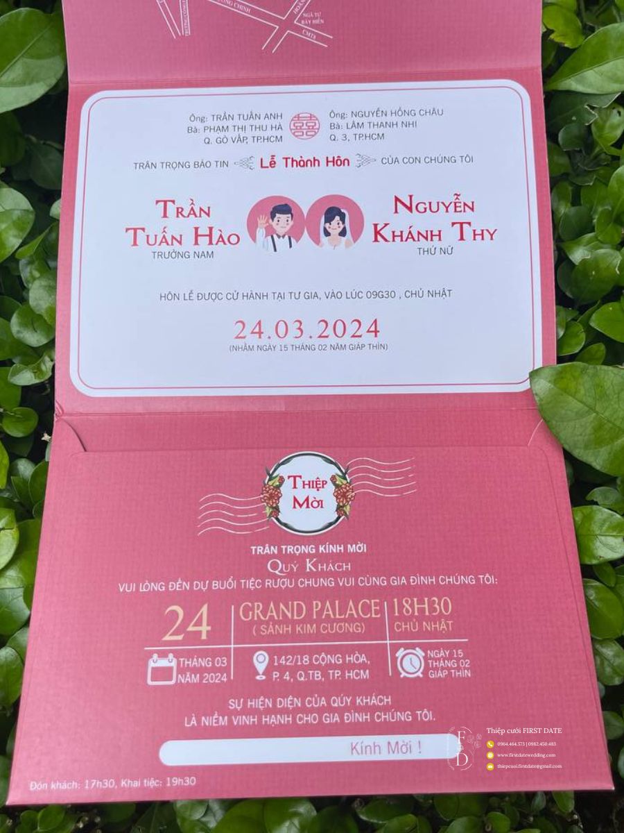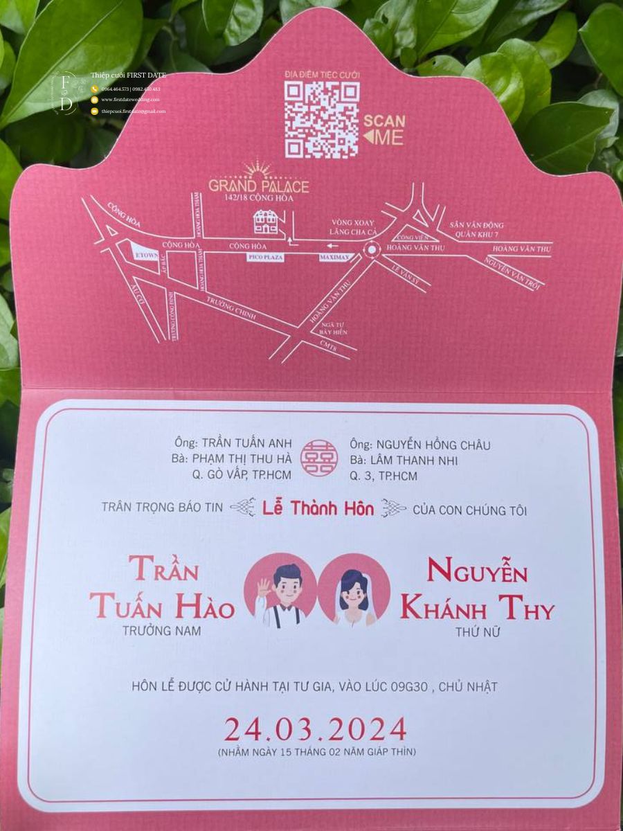 Địa Chỉ: 347/53 Lê Văn Thọ, P. 9, Q.Gò Vấp, TP. HCM (Hiện tại, cửa hàng đang sửa chữa. Bạn liên hệ trước khi đến hoặc đặt thiệp online nhé) Website: Thiệp cưới First Date SĐT: 0964.464.573 (Khang) – 0982.450.483 (Đông) Fanpage: #thiepcuoifirstdate Email: thiepcuoi.firstdate@gmail.c |