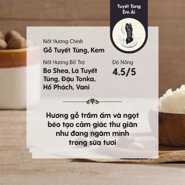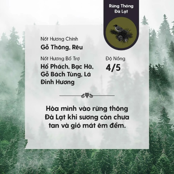 Mỗi ngày là một mùi hương khác nhau, tùy theo tâm trạng. Đôi lúc cảm thấy khó vào giấc ngủ, Da Lat Forest là một sự lựa chọn tốt để hòa mình vào rừng lạnh buổi đêm. Ngày cảm thấy buồn tẻ, thử chút tỉnh táo của Gỗ Thông hoặc Hổ phách Gleaming Amber ngọt ngào thêm năng lượng.