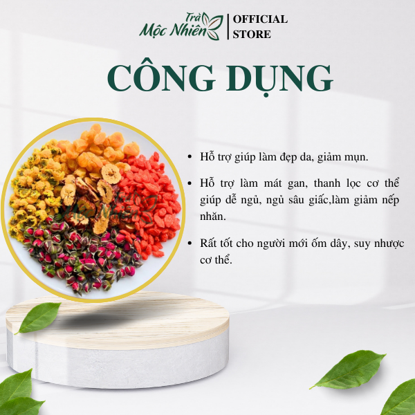 - Hỗ trợ giúp làm đẹp da, giảm mụn, - Hỗ trợ làm mát gan, thanh lọc cơ thể, giúp dễ ngủ, ngủ sâu giấc,làm giảm nếp nhăn.
