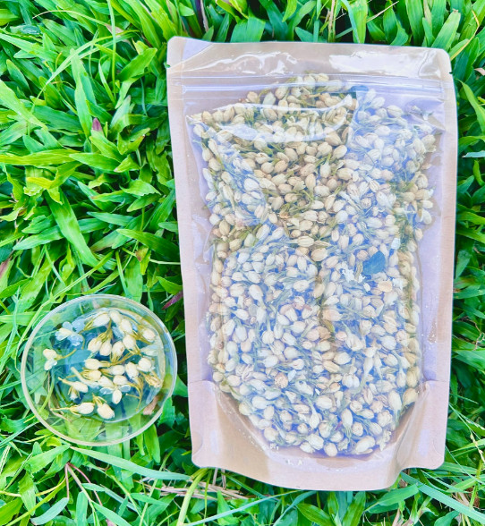 - Cho khoảng 5g hoa nhài khô vào ấm trà. Cho một ít nước sôi vào ấm để tráng trà, sau 30 giây thì bạn đổ lượt trà này đi. Thêm khoảng 200ml nước sôi vào ấm trà và đợi khoảng 5-7 phút cho trà ngậm nước là có thể thưởng thức.