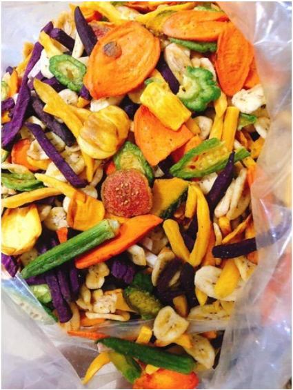 ➖ Thành phần: Cà rốt, Đậu đũa, khoai lang tím, Khoai lang vàng, Khổ qua, Chuối sấy, Mít sấy, đậu bắp