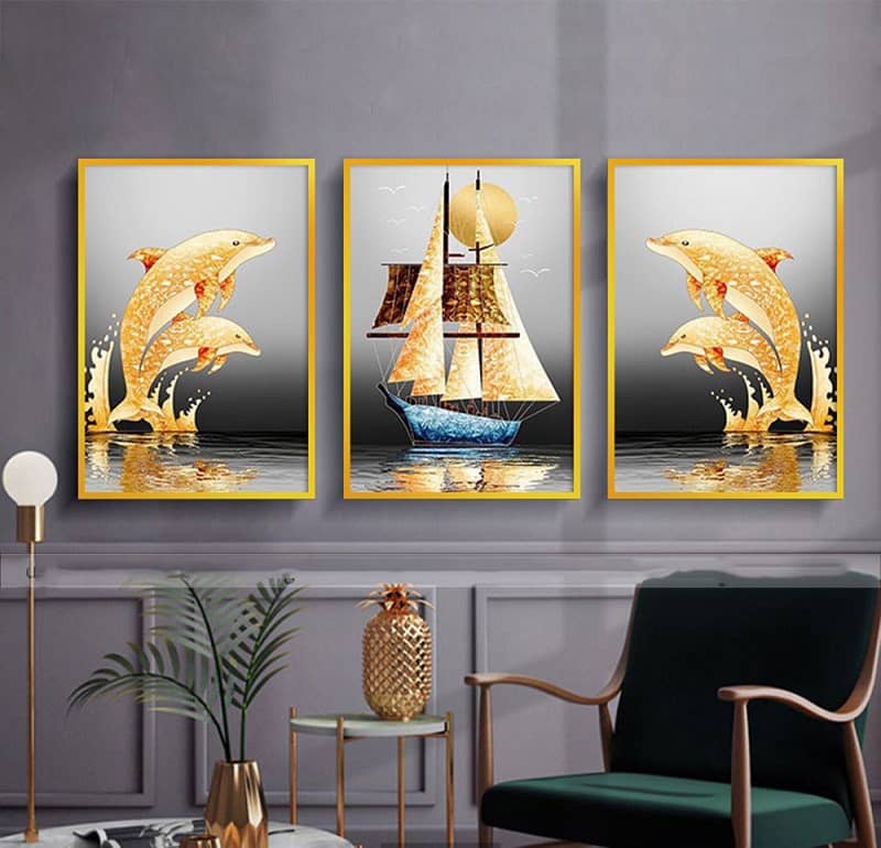 Tranh được kết hợp bởi 3 bức tranh, ở giữa là thuyền buồm tượn trưng cho sự may mắn phù hợp với các gia đình kinh doanh và doanh nghiệp, với màu sắc viền tranh và màu tranh chính là màu vàng, đó là màu của may mắn và thịnh vượng