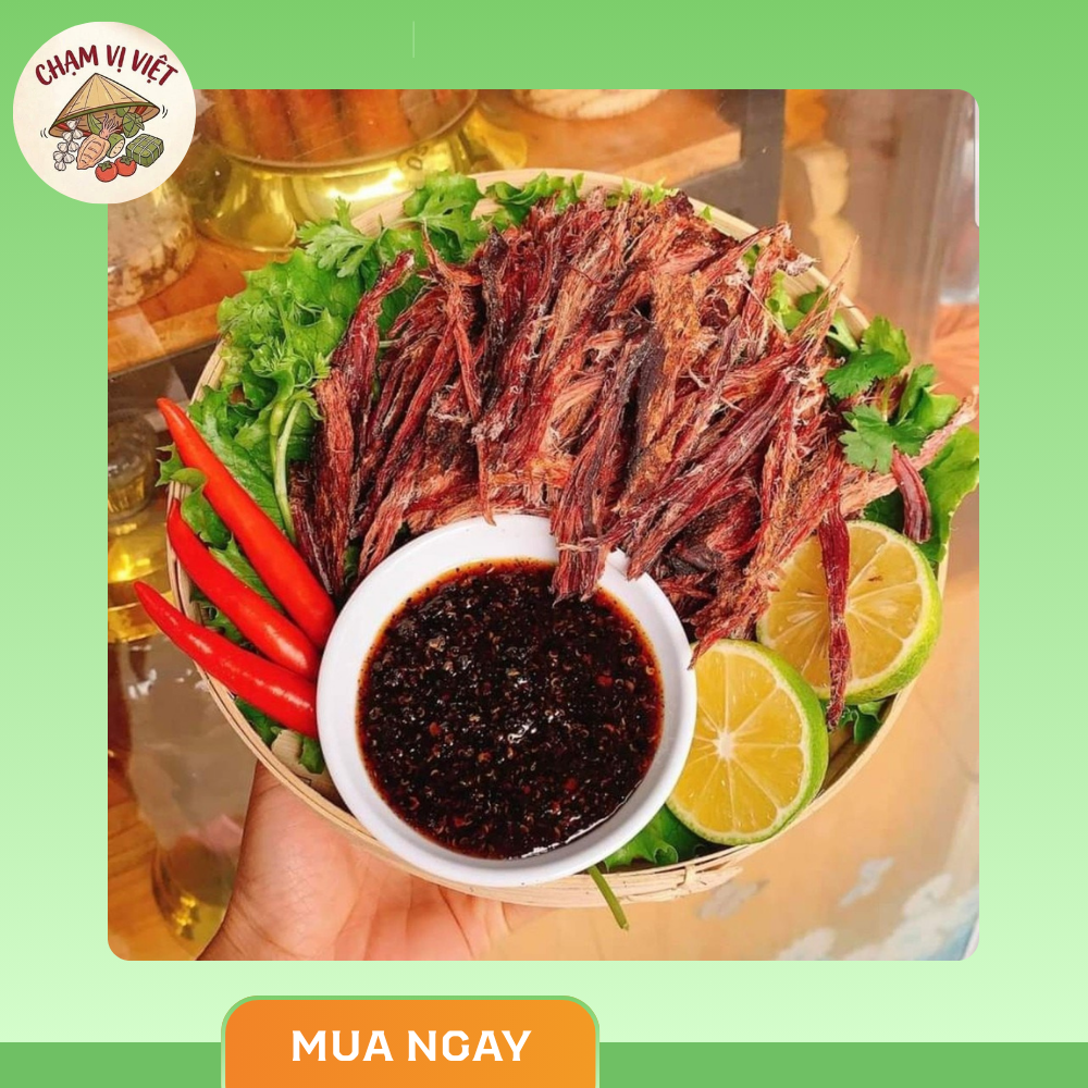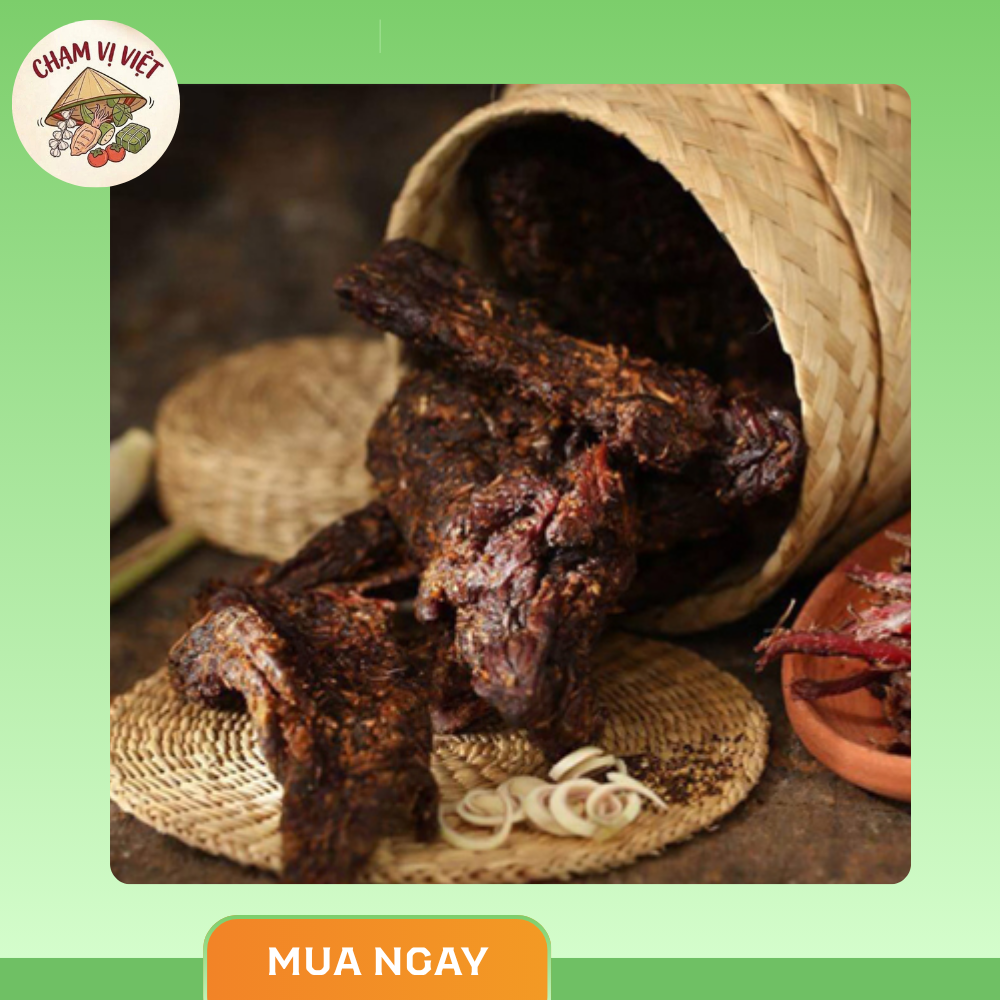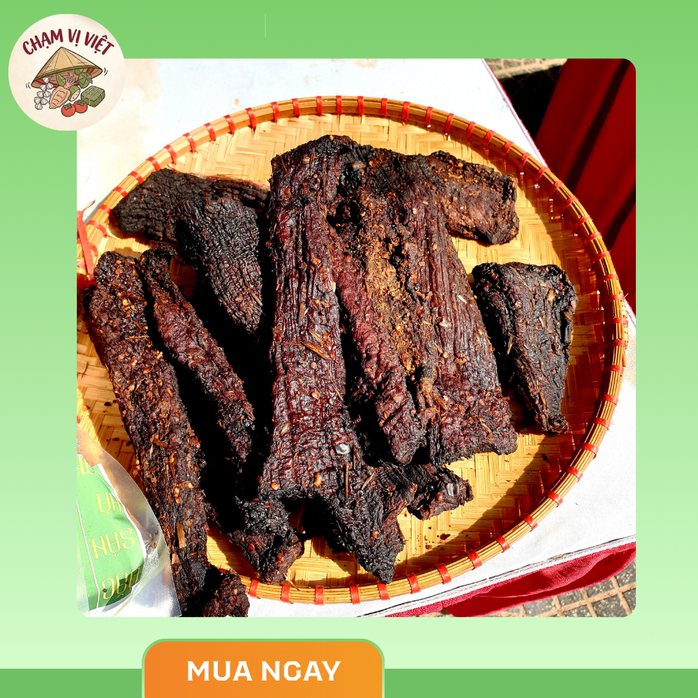 Trâu gác bếp Chạm Vị Việt là đặc sản Tây Bắc nổi tiếng, được chế biến theo phương pháp hun khói truyền thống. Từng thớ thịt dai mềm, thấm đượm gia vị núi rừng, mang đến hương vị đậm đà, cay nhẹ và thơm nồng đặc trưng khó quên.