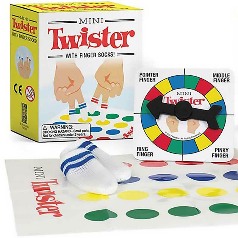 Phiên bản Mini Twister Miniature của Running Press Kit có kích thước khoảng 3 inch x 1,4 inch x 3,4 inch. Nó bao gồm một tấm thảm twister nhỏ, con quay, 2 bộ vớ ống nhỏ và một cuốn sách nhỏ về trò chơi Twister. Trò chơi Mini Twister với Finger Socks của chúng tôi là kích thước hoàn hảo cho một dụng cụ nhồi tất!