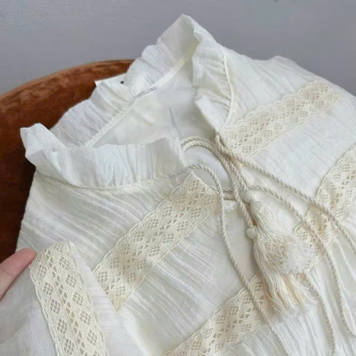 Thiết kế độc đáo: Cổ trụ phối dây rút thêu họa tiết tinh xảo, tạo điểm nhấn hút mắt. Tay lỡ phối ren nhẹ nhàng, nữ tính.