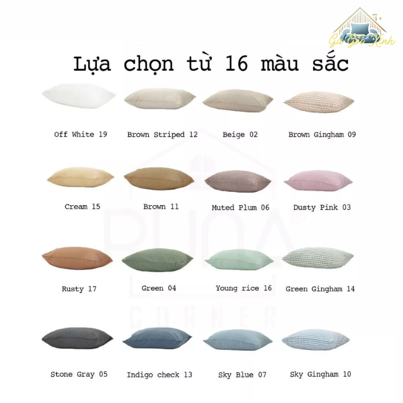 Thương hiệu: Gagoixinh Chất liệu: 100% cotton tự nhiên Kích thước: Size S: 45x65cm Size M: 50x70cm Màu sắc: Nhiều màu trung tính và pastel, dễ phối với ga giường, chăn cotton, Tencel, lụa. Đặc điểm: Bề mặt cotton mềm mại, thoáng khí, phù hợp cho da nhạy cảm. Vải đã giặt enzyme – không xù, không nhăn, giữ màu tốt. Khóa kéo chắc chắn, dễ thay vỏ. Phù hợp dùng cho gia đình, homestay, khách sạn.