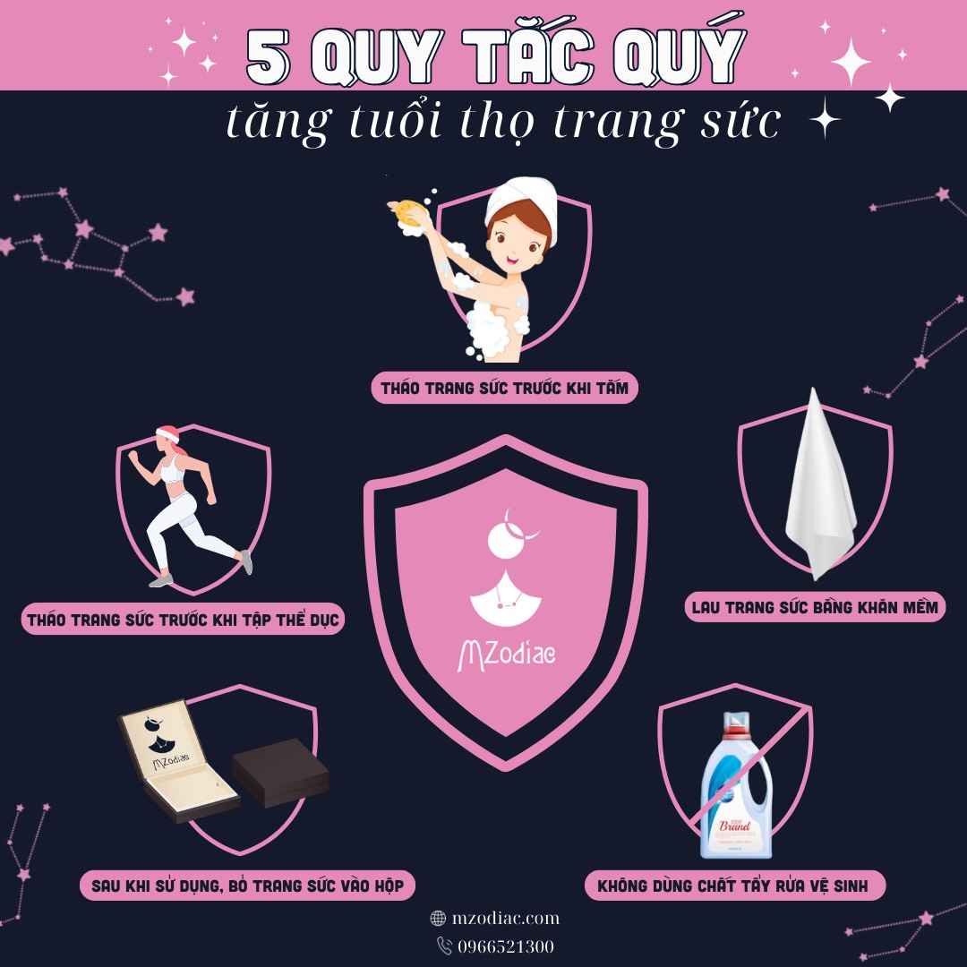 – Khi không đeo, bảo quản trang sức nơi khô ráo, tránh ánh nắng trực tiếp, nơi có nhiệt độ cao hoặc ẩm thấp.