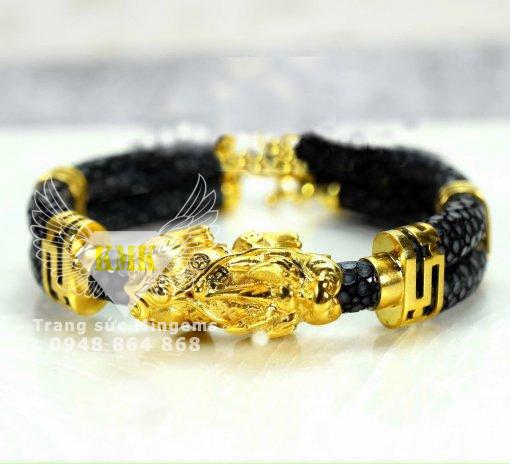 Vòng tay da cá đuối bọc vàng 18k mix Tỳ Hưu tài lộc và may mắn, ghép đôi hai vòng tay kép tạo nên sự mạnh mẽ và sang trọng nhất cho nam giới. Hiện nay trên thị trường có rất nhiều mẫu vòng tay như vòng tay da cao cấp bọc vàng, vòng tay cao su bọc vàng, vòng tay lông đuôi voi cũng rất độc lạ. Và gần đây nhất xuất hiện trên thị trường đó là vòng tay da cá đuối bọc thêm vàng cũng rất được ưa thích.