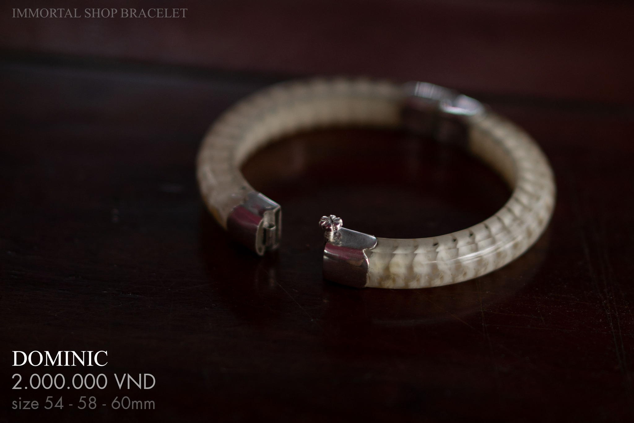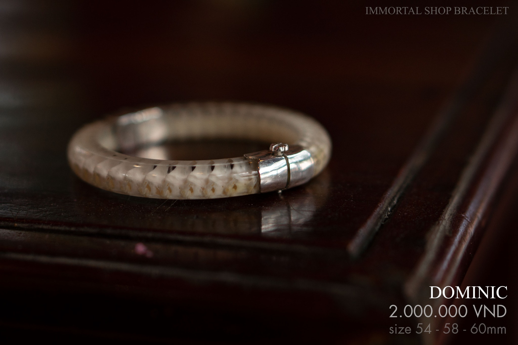 Vòng tay xương rắn - Dominic được bọc từ nhựa resin và làm thủ công từ trang trại rắn ở Cà Mau thể hiện sự gai góc cái tôi và sự độc đáo riêng biệt thể hiện bản thân.