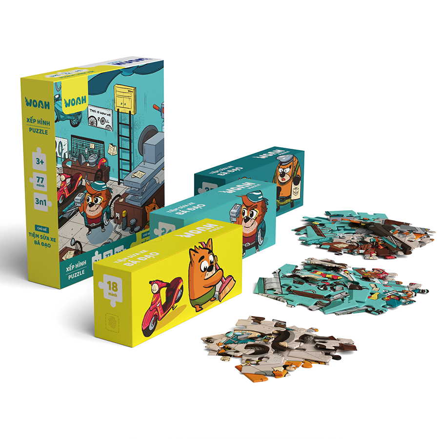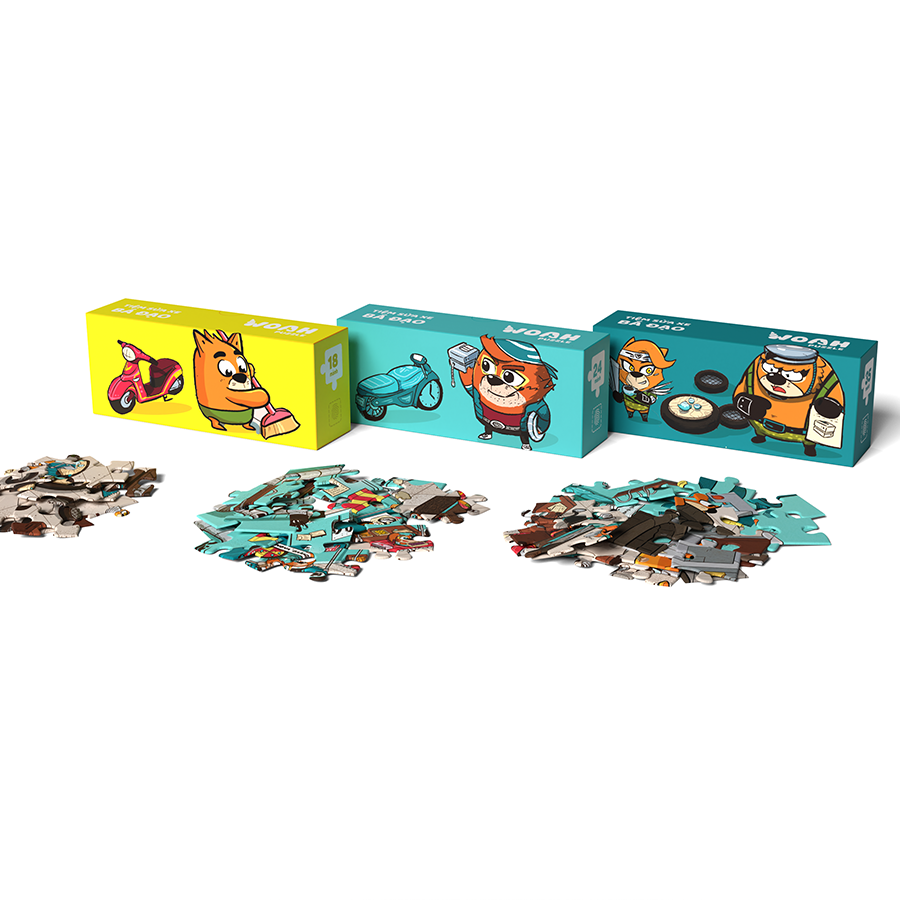 Bé có thể giải từng bộ 1 để làm quen với trò chơi xếp hình. Sau đó tăng dần độ khó. Chú ý đến hình vẽ và màu sắc ở các miếng ghép, bé sẽ dễ dàng vượt qua thử thách. Khi xếp cả 3 bộ lại, bé sẽ có một bức tranh mô hoàn chỉnh.