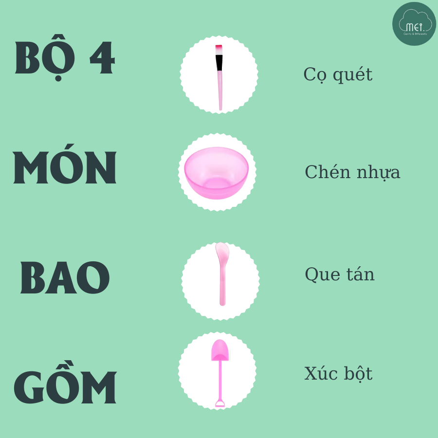 Việc chăm sóc da mặt là việc mà chúng ta phải làm để giúp làn da khỏe mạnh. Bộ dụng cụ đắp mặt nạ 4 món của nhà Mei đẹp và tiện lợi, màu sắc xinh xắn và sẽ là bảo bối thật tốt của bạn.