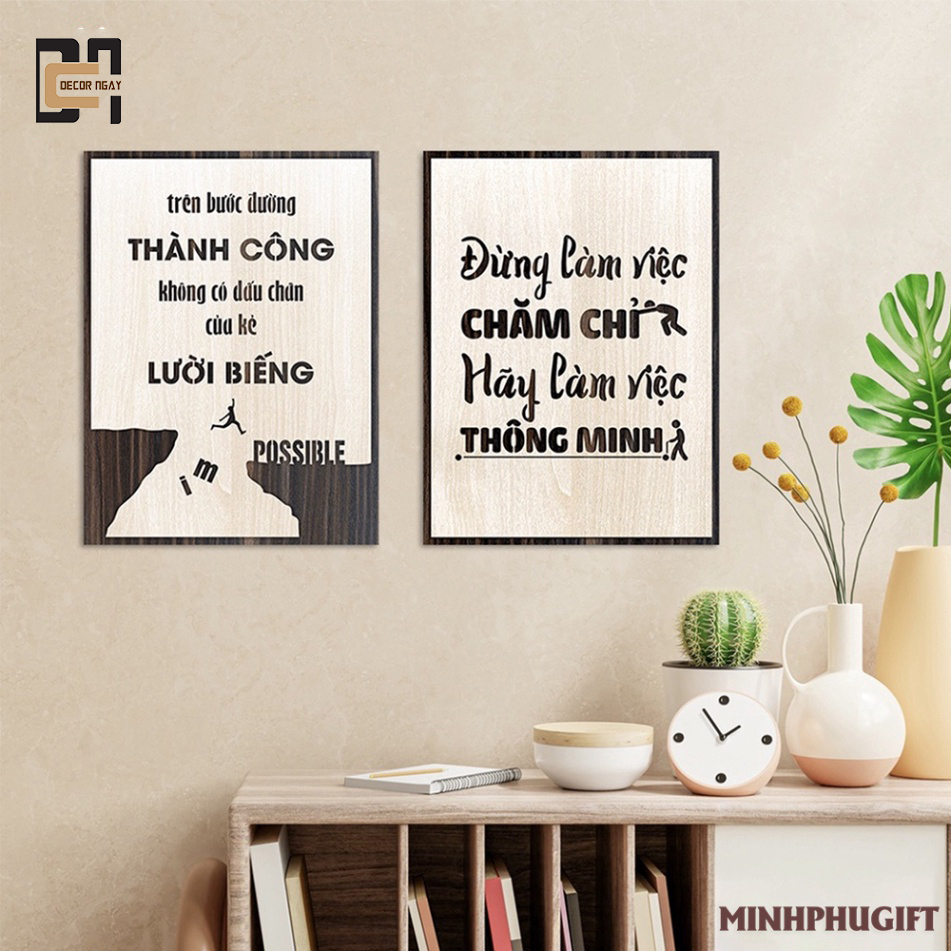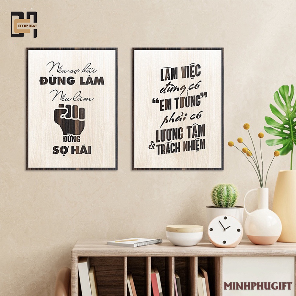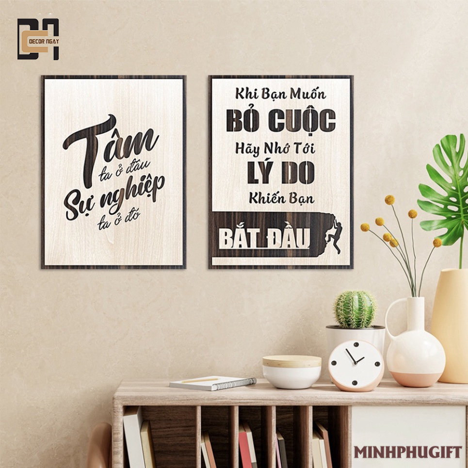 ẨM ĐƯỢC SHOP TỰ CHỤP NÊN BẢO ĐẢM GIAO HÀNG GIỐNG 100% NHƯ QUẢNG CÁO ☀☘️ ⚡️⚡️ Thông số kỹ thuật - Sản phẩm: trang treo tường gỗ khắc laser - Kích thước nhỏ: 20x30cm - Kích thước trung bình: 30x40cm - Kích thước lớn: 40x60cm - Trọng lượng: 650g - Độ dày: 8mm - Màu sắc: Vân gỗ venner 2 lớp - Nội dung: có nhận thiết kế theo yêu cầu - Mặt sau: có sẵn keo dán tường hoặc dây treo ☘️ ƯU ĐIỂM - Sản phẩm được làm bằng chất liệu gỗ MDF chống thấm phủ venner cao cấp lõi xanh. - Sản xuất trực tiếp tại xưởng MINH PHU sử dụng máy laser kỹ thuật cao cùng tay nghề gia công kỹ lưỡng trên từng sản phẩm - Màu sắc bề mặt vân gỗ 2 lớp tương phản với màu vân sáng bên trên và màu vân gỗ tối bên dưới kết hợp tạo nên sự tinh tế - Vật liệu thân thiện với môi trường, có sản keo mặt sau để dán lên tường nhanh chóng - Thiết kế hình ảnh nội dung miễn phí theo yêu cầu của bạn và nhận gia công theo kích thước của bạn ☀ NHƯỢC ĐIỂM - Bị thấm nước khi để ngoài trời mưa ✔ Tranh treo tường Gỗ trang trí phòng tạo động lực phù hợp để sử dụng cho nhiều không gian khác nhau như: nhà ở, văn phòng, quán cafe, nhà hàng, khách sạn, trường học, bệnh viện, homestay, các khu vực công viên công cộng, hồ bơi,... phòng làm việc và phòng học tập