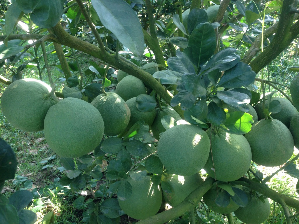 Bưởi da xanh Hoàng Long, sản phẩm Hữu cơ từ lúc cuẩn bị đất trồng đến cây giống và nay được 5 năm tuổi cho lứa thương mại đầu tiên, sản lượng 100 tấn/ tháng/ 60 ha.